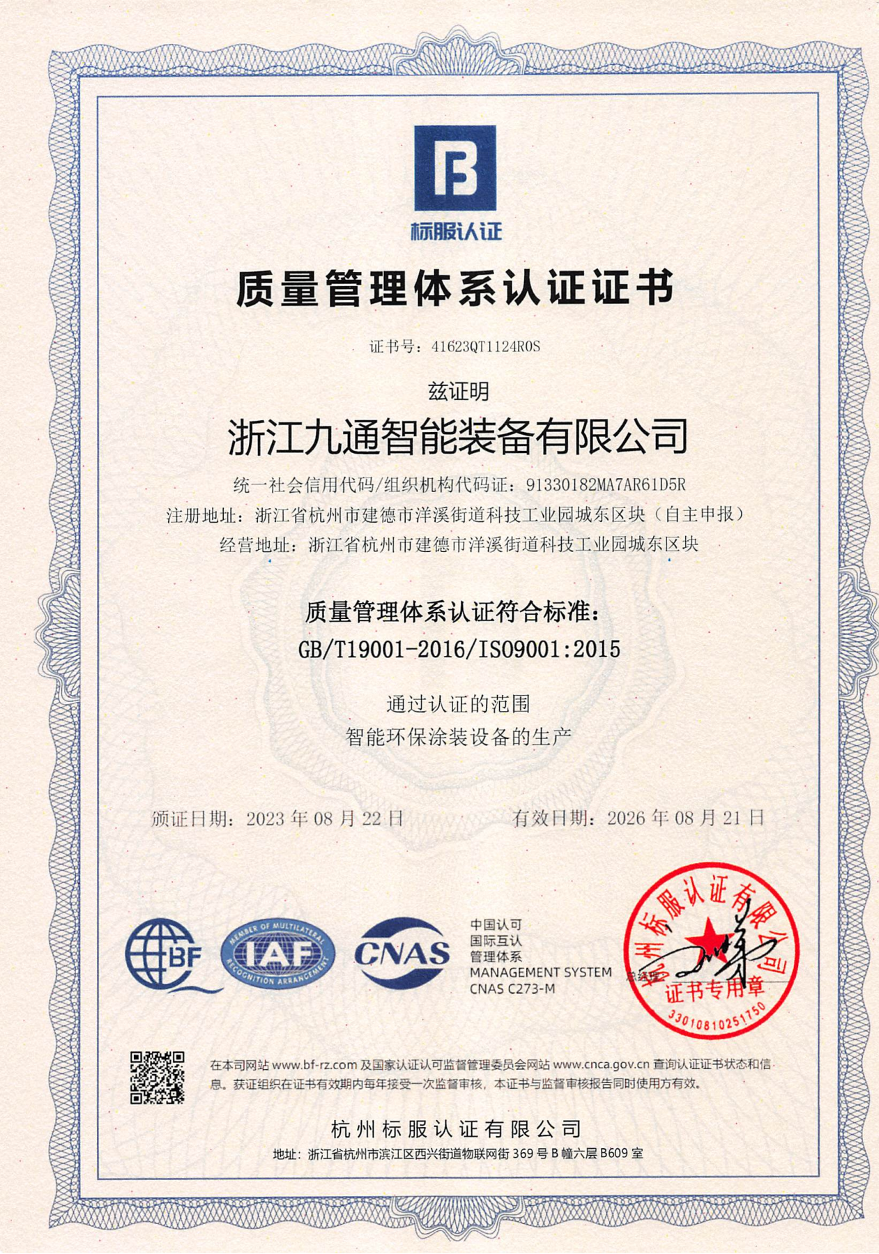 浙江九通智能裝備有限公司簡稱九通,由“譽滿九州 廣陌通衢”而來,成立于2011年,專注于智能環(huán)保涂裝整體解決方案系統(tǒng),是一家集咨詢、勘察、設(shè)計、研發(fā)、生產(chǎn)、銷售、安裝、調(diào)試、交付、運維于一體的專業(yè)服務(wù)廠商,研發(fā)總部位于北京,生產(chǎn)基地設(shè)立于浙江、山東、廣東。產(chǎn)品包括涂裝生產(chǎn)線、噴砂房、噴漆房、涂裝機器人、烤漆房、噴漆烘干一體房、除塵設(shè)備、有機廢氣處理設(shè)備等,客戶群體包括風(fēng)電、軌道交通、航空航天、專用車、汽車、結(jié)構(gòu)件、石油裝備、工程機械、礦工機械等領(lǐng)域,項目經(jīng)驗豐富!
